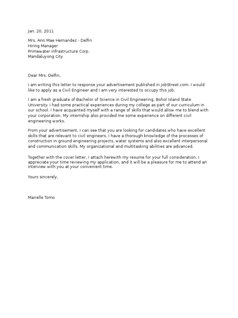 Example application letter for fresh graduate civil engineer free download as word doc doc docx pdf file pdf text file txt or read online for free. Take a careful look at the job description noting any skills or experiences that the description indicates. Cover letter sample for fresh civil engineering graduate. Application letter writing tip.