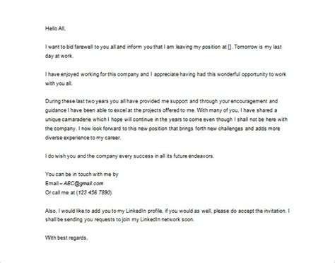 Saying goodbye is 8 on the list of 15 things to do before leaving a job. Hello as you know date is my last day with abc corp. Apart from your position or reason behind vacating the job writing a thank you letter while leaving a company is a great gesture to show your gratitude for co workers and other peoples of the company. I wish you all the success in the world.