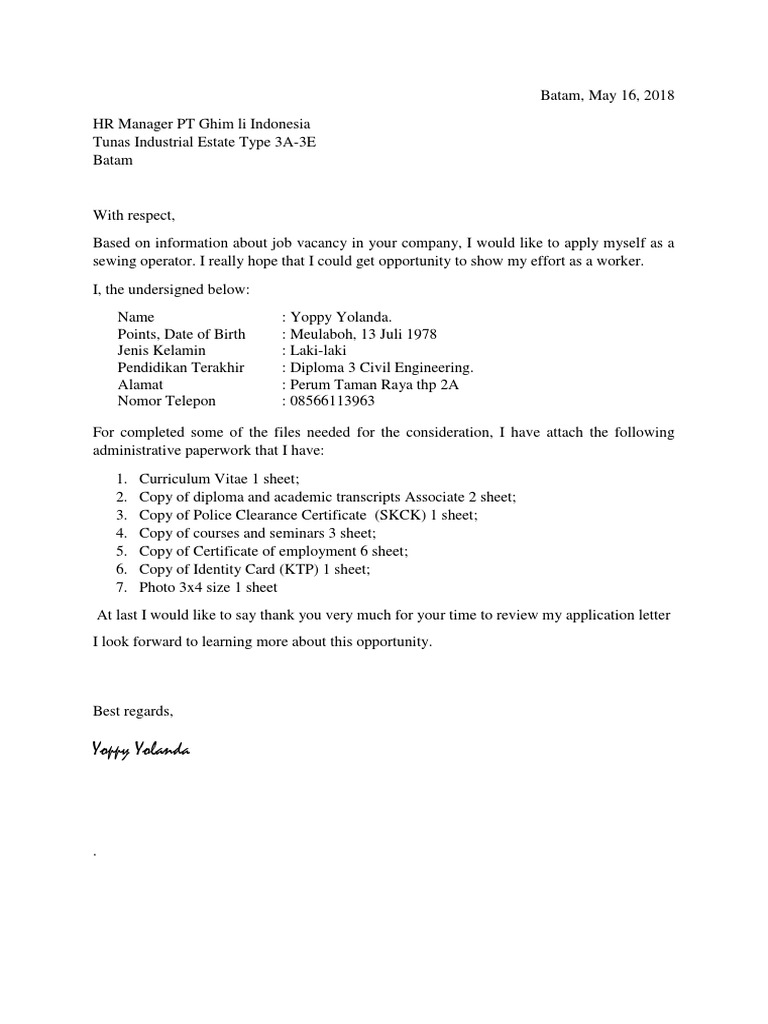 Respectly in accordance with the offer of a job vacancy from femina magazine group i volunteered to be the editor in the femina magazine group. Dewasa ini keahlian berbahasa inggris semakin dikampanyekan dalam dunia profesional. Demikian informasi yang bisa kami sampaikan berkaitan dengan contoh application letter. Job application atau surat lamaran pekerjaan adalah surat yang menunjukan ketertarikan dan keinginan kita terhadap sebuah posisi atau pekerjaan di sebuah perusahaan.