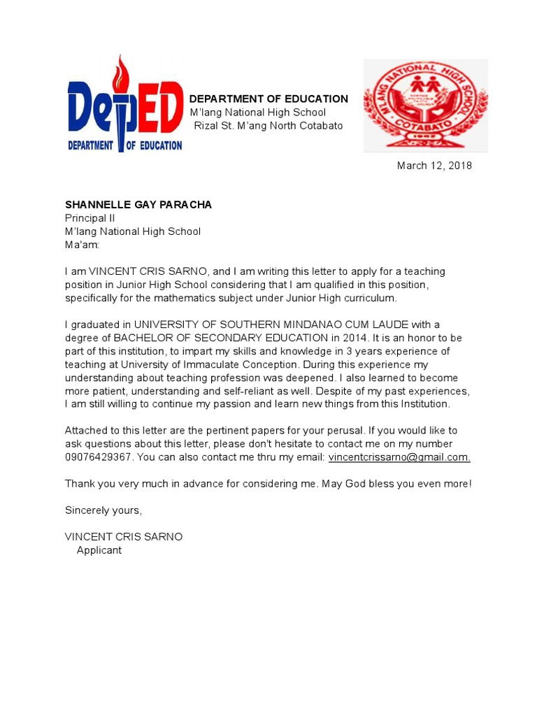 Principal name of school school address city or municipality province region attention. This is to formally express the intent of the undersigned to compete in the ranking and selection process and to hopefully get. January 7 2016 dr. I have attached my experience letter with application form too.