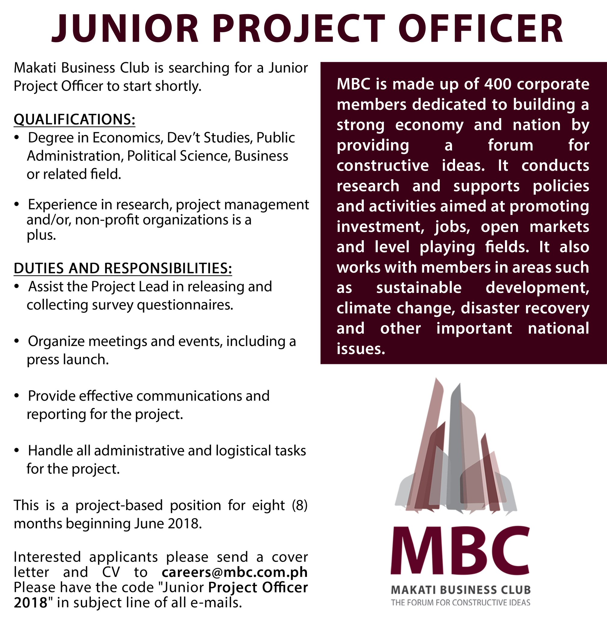 Makati Business Club Op Twitter Mbccareers Is Looking For A Junior Project Officer To Apply Please Send Your Cover Letter And Cv To Careers Mbc Com Ph With The Code Junior Project Officer 2018 In