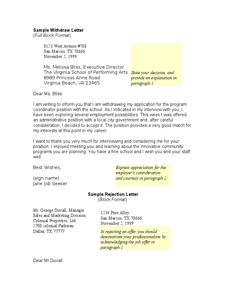Job Offer Rejection Letter Template For Word