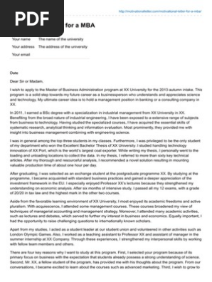Motivation letter for mba motivation letter for study. I wish to apply to the master of business administration program at xx university for the 2013 autumn intake. When writing your letter for mba it is important that you state your academic history as well as your skills and interests so that the reader will get an idea on how your mba will affect your career path and your life. Sample mba recommendation letter 2 text version dear admission committee i willingly offer my recommendation for smith marks application for admission to your mba program.
