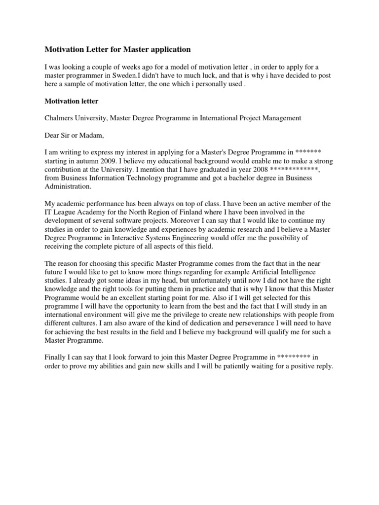 95 sample motivation letter for university application. The four year undergraduate program in name od the programme formed the basis of my perseverance towards achieving an in depth knowledge in. Job applications usually require a cover letter instead. I am interested to apply for a masters degree program in name od the programme starting in 2013. Obtaining a letter of motivation for a masters degree is an important aspect to build ones career path and secure a good job after its completion.